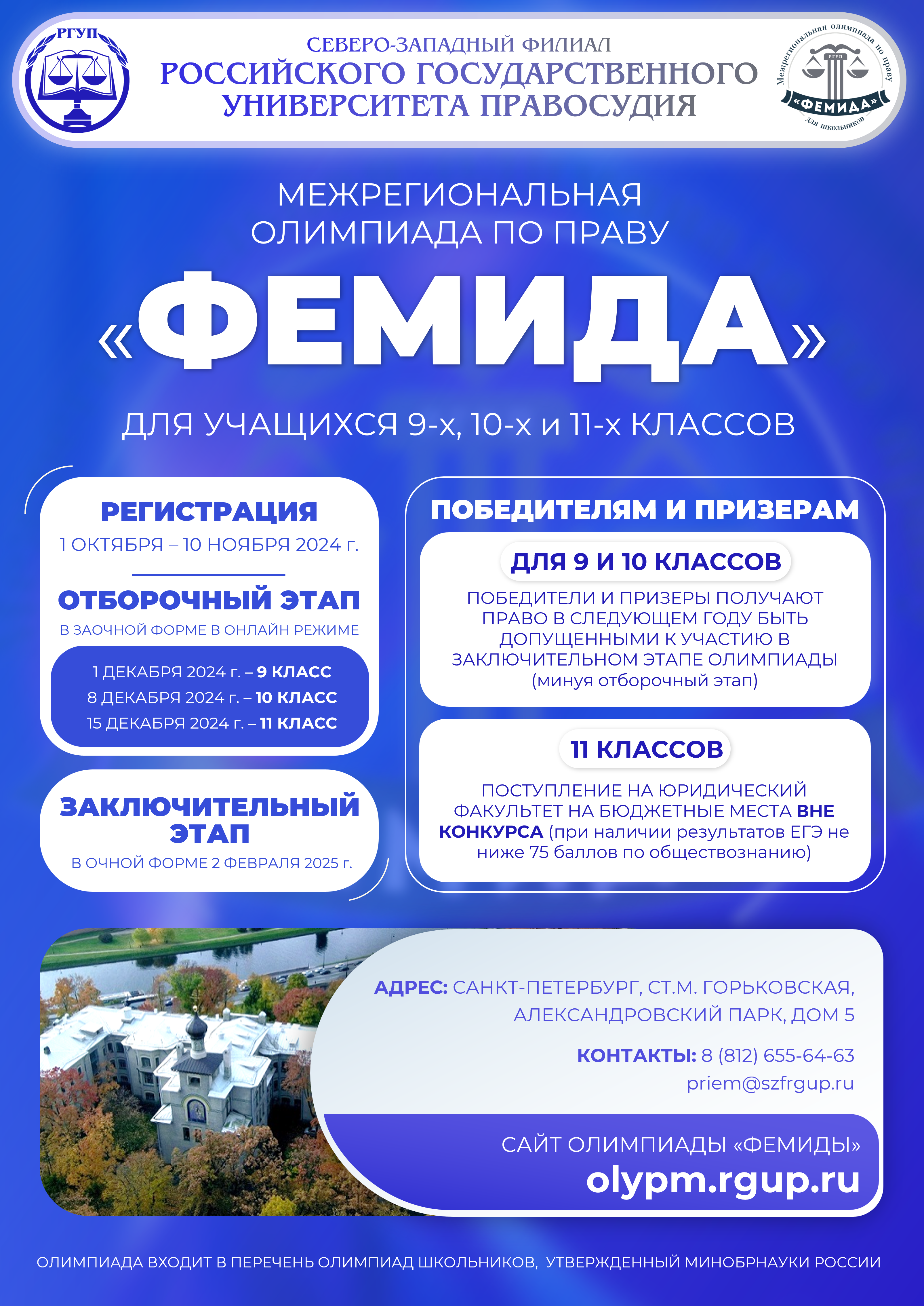 отборочный этап. Подробная информация размещена на сайте https://olymp.rgup.ru/ С уважением, Приемная комиссия Российский государственный университет правосудия имени В.М. Лебедева Северо-Западный филиал 8 (812) 655-64-63 priem@mail.szfrgup.ru г. Санкт-Петербург, Александровский парк, 5 |